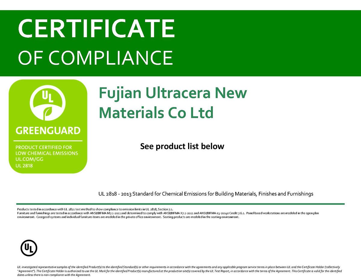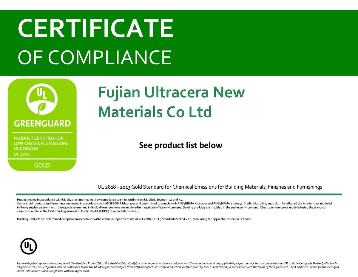 Ultracerasurfaces with GreenGuard and GreenGuard Gold certifications excel in eco-friendly innovation, ensuring products with low chemical emissions for healthier indoor environments. Our commitment to sustainability and health is at the core of these prestigious recognitions.
