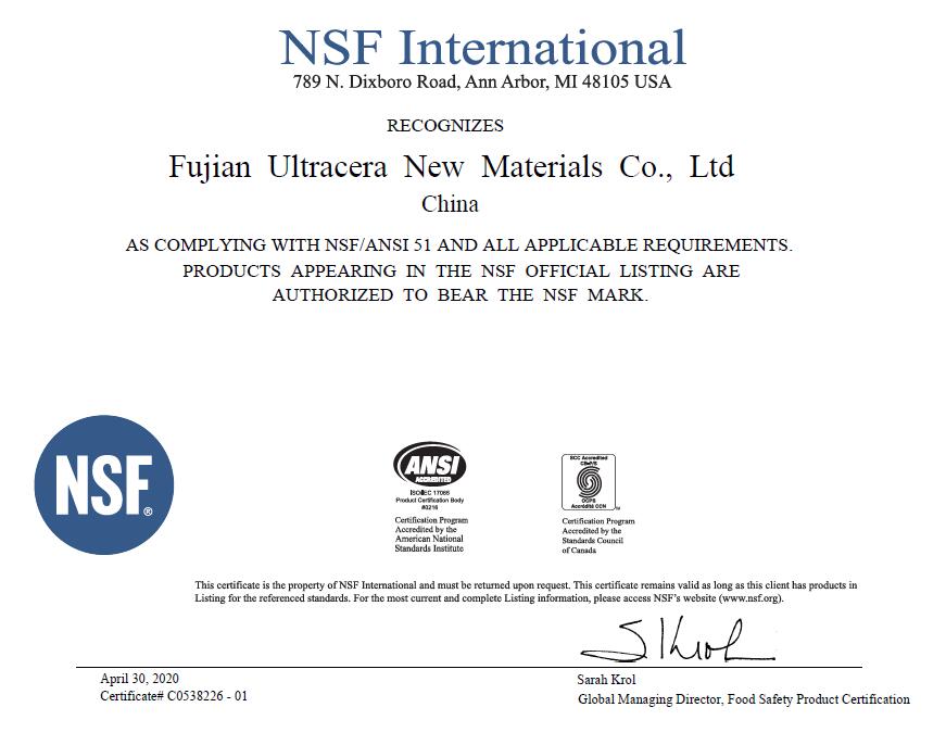 NSF International officially recognizes Ultracerasurfaces as complying with NSF/ANSI 51 standards for food equipment materials. This certification affirms that products listed in the NSF Official Listing meet rigorous health and safety requirements and are authorized to carry the esteemed NSF mark. With this certification, Ultracerasurfaces demonstrates adherence to the highest product safety and public health standards.”