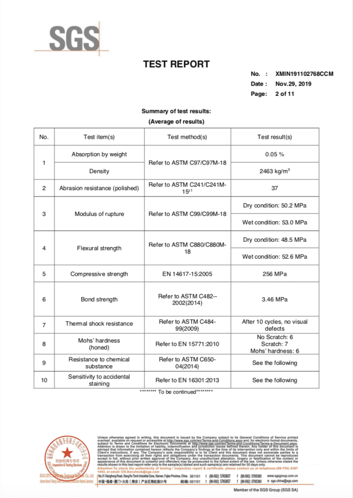 We are committed to transparency and excellence. Dive into our comprehensive performance test results, where we detail our materials’ superior quality and resilience. Our products are rigorously tested against stringent ASTM and EN standards to ensure unmatched durability, density, and strength. From abrasion resistance to thermal shock resilience, we assure you that our surfaces are crafted to last. Explore the evidence that sets our standards above the rest.